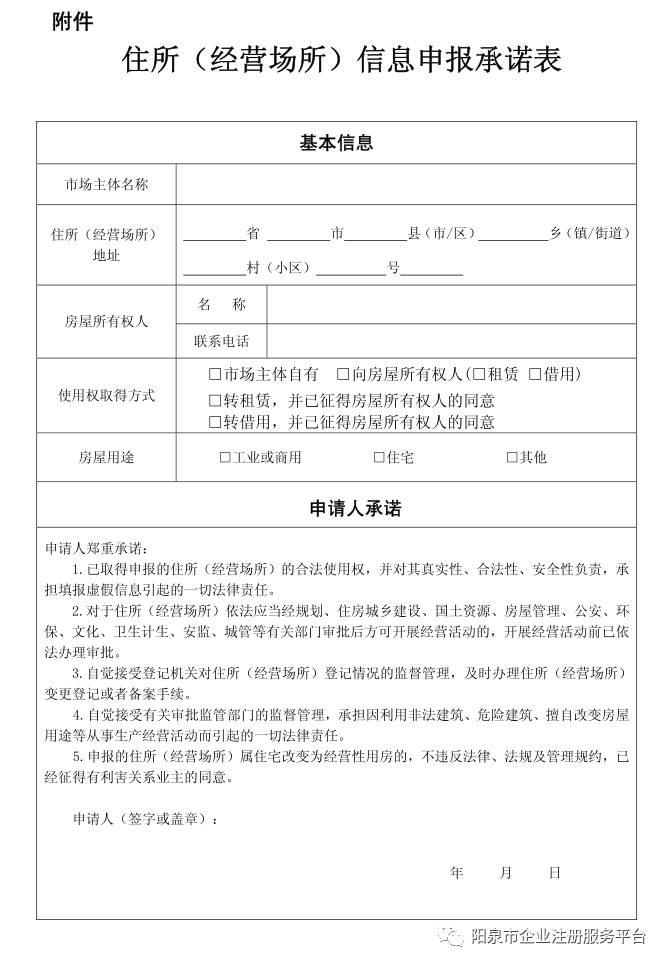 第四条市场主体的住所(经营场所)登记实行申报登记制,申请人提交载明住所(经营场所)信息,以及对房屋真实性、合法性、安全性负责的申报承诺表,即可办理注册登记。法律、法规、规章对市场主体住所(经营场所)另有规定的,从其规定。